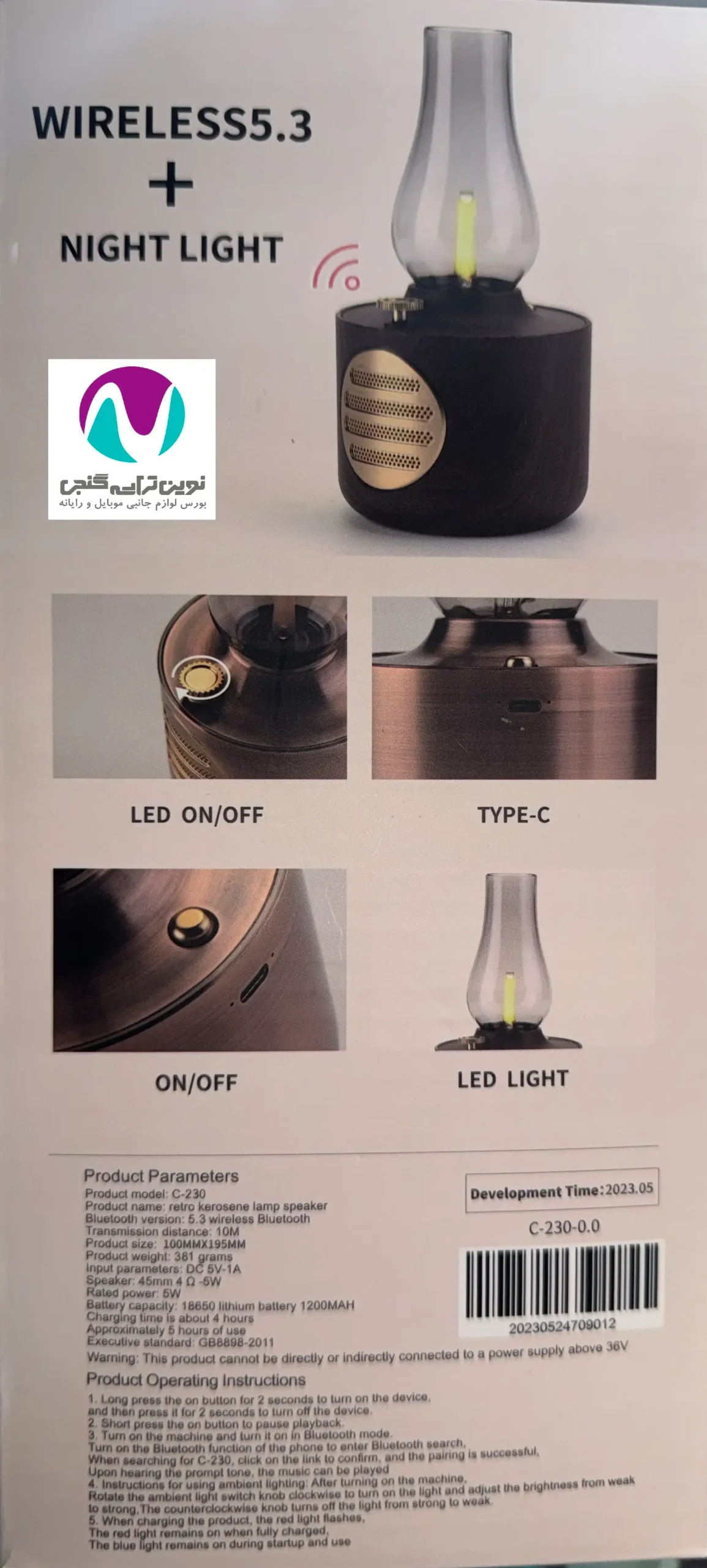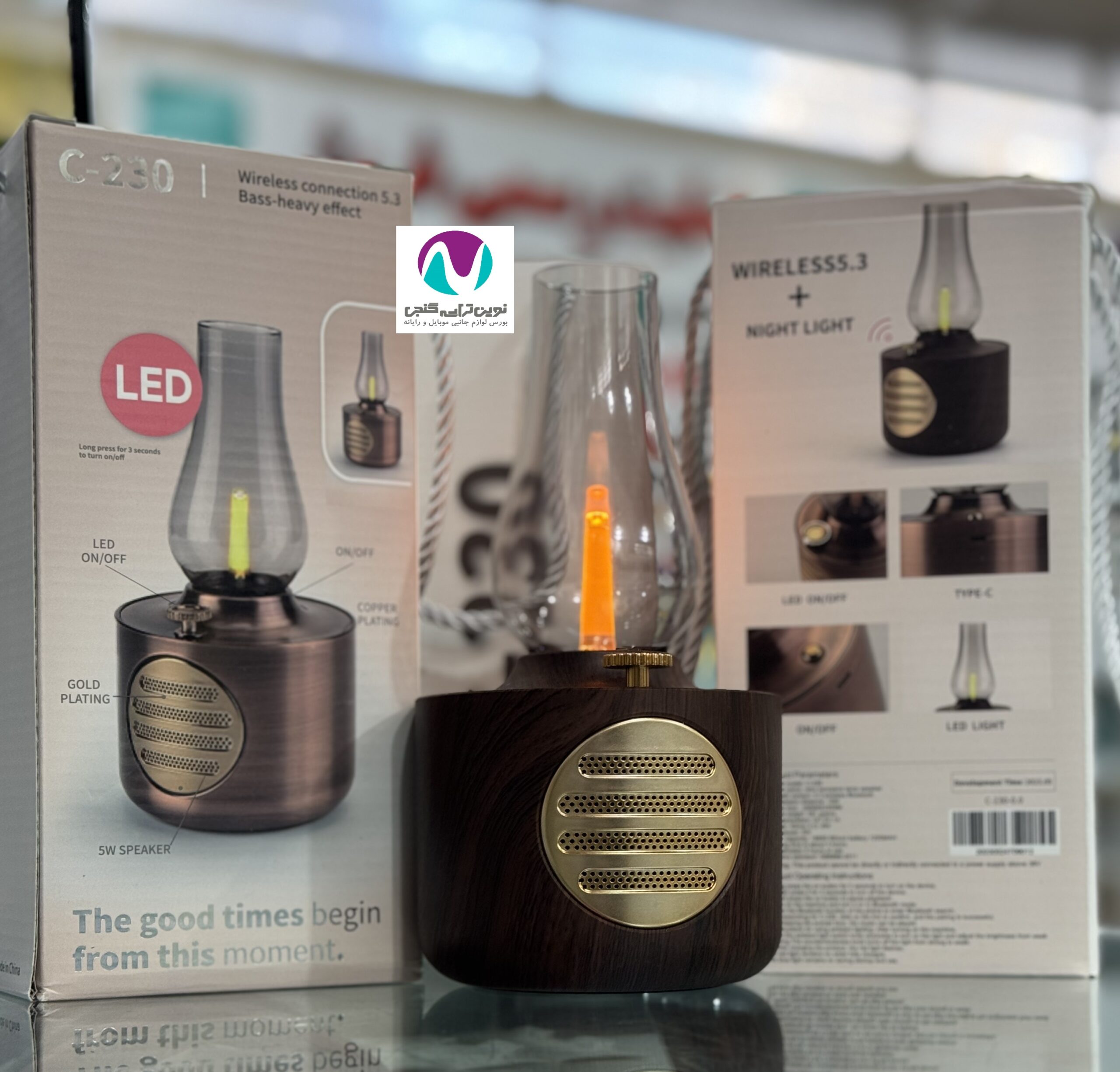 اسپیکر بلوتوثی مدل C-230 با طراحی خاص و الهام‌گرفته از لامپ‌های نفتی قدیمی، تجربه‌ای متفاوت از پخش موسیقی همراه با نورپردازی آرام‌بخش را برای شما فراهم می‌کند.