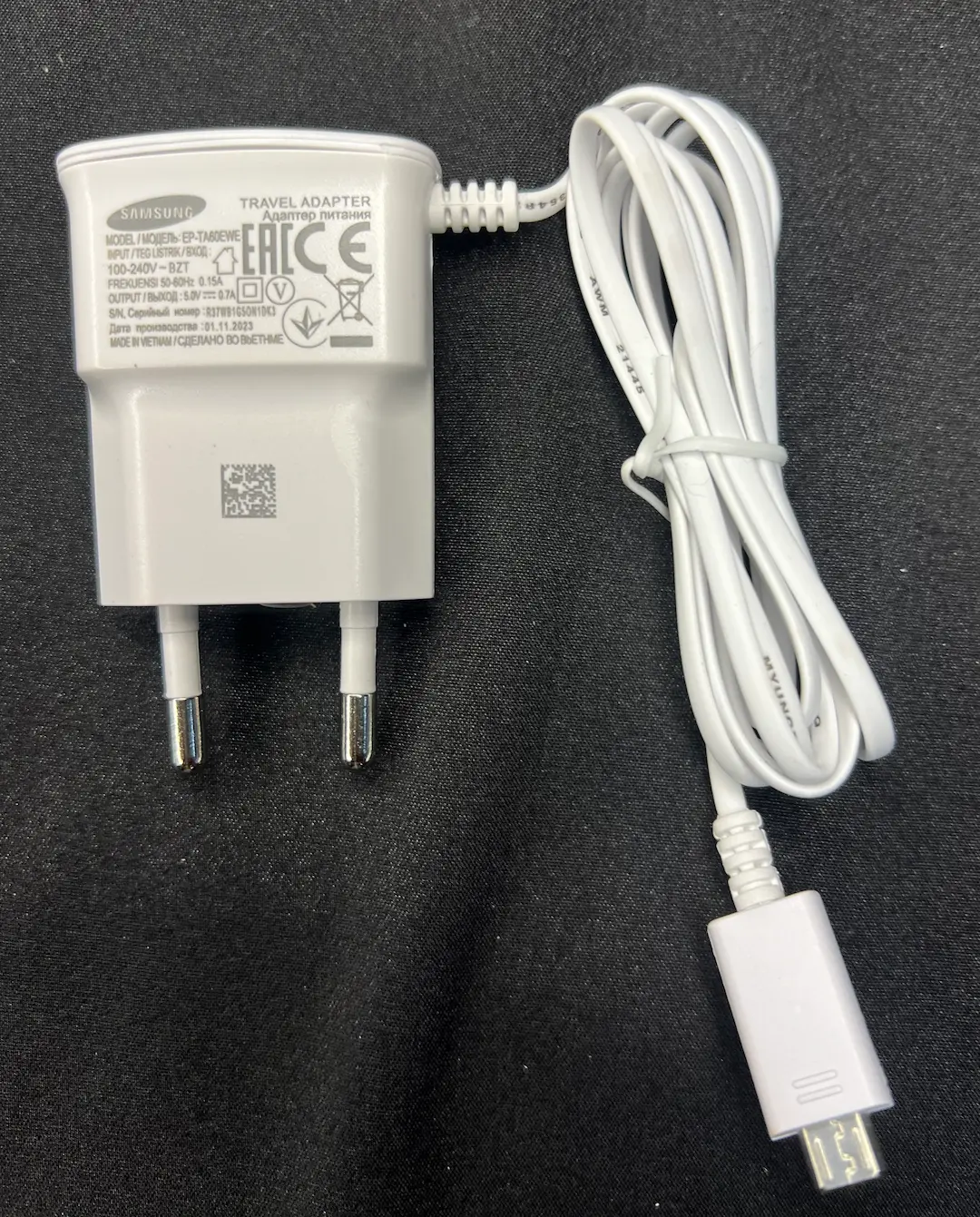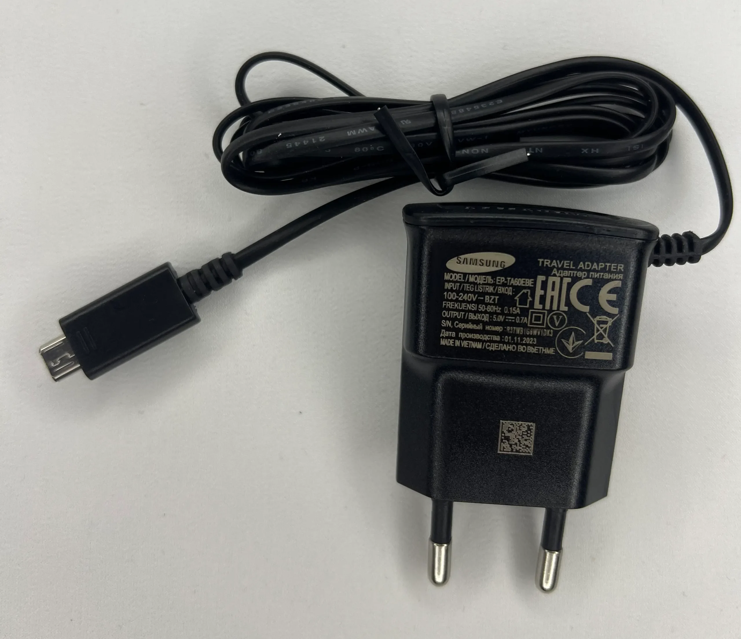 شارژر SAMSUNG i9000 دارای یک کابل اندرویدی متصل به بدنه است.