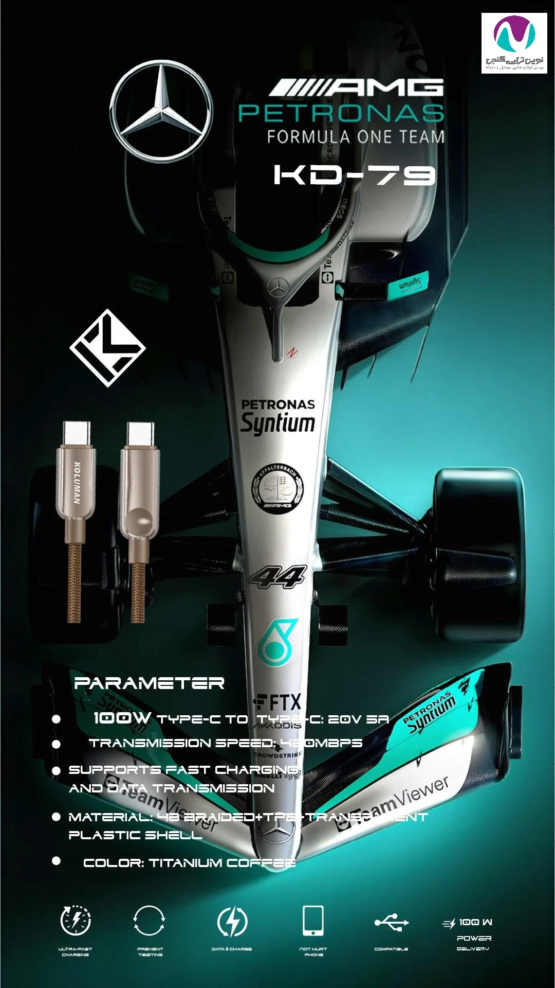 کابل شارژر کلومن مدل KD-79 TC-TC 100W با طول ۱ متر، طراحی مقاوم و توان خروجی ۱۰۰ وات، گزینهای ایدهآل برای شارژ سریع دستگاههای مجهز به پورت USB-C مانند لپتاپها و گوشیهای هوشمند است. این کابل با سرعت انتقال داده تا ۵ گیگابیت بر ثانیه، امکان جابهجایی سریع فایلها را فراهم میکند. نمایشگر دیجیتال روی بدنه کابل، وضعیت شارژ یا توان مصرفی را بهصورت لحظهای نمایش میدهد.