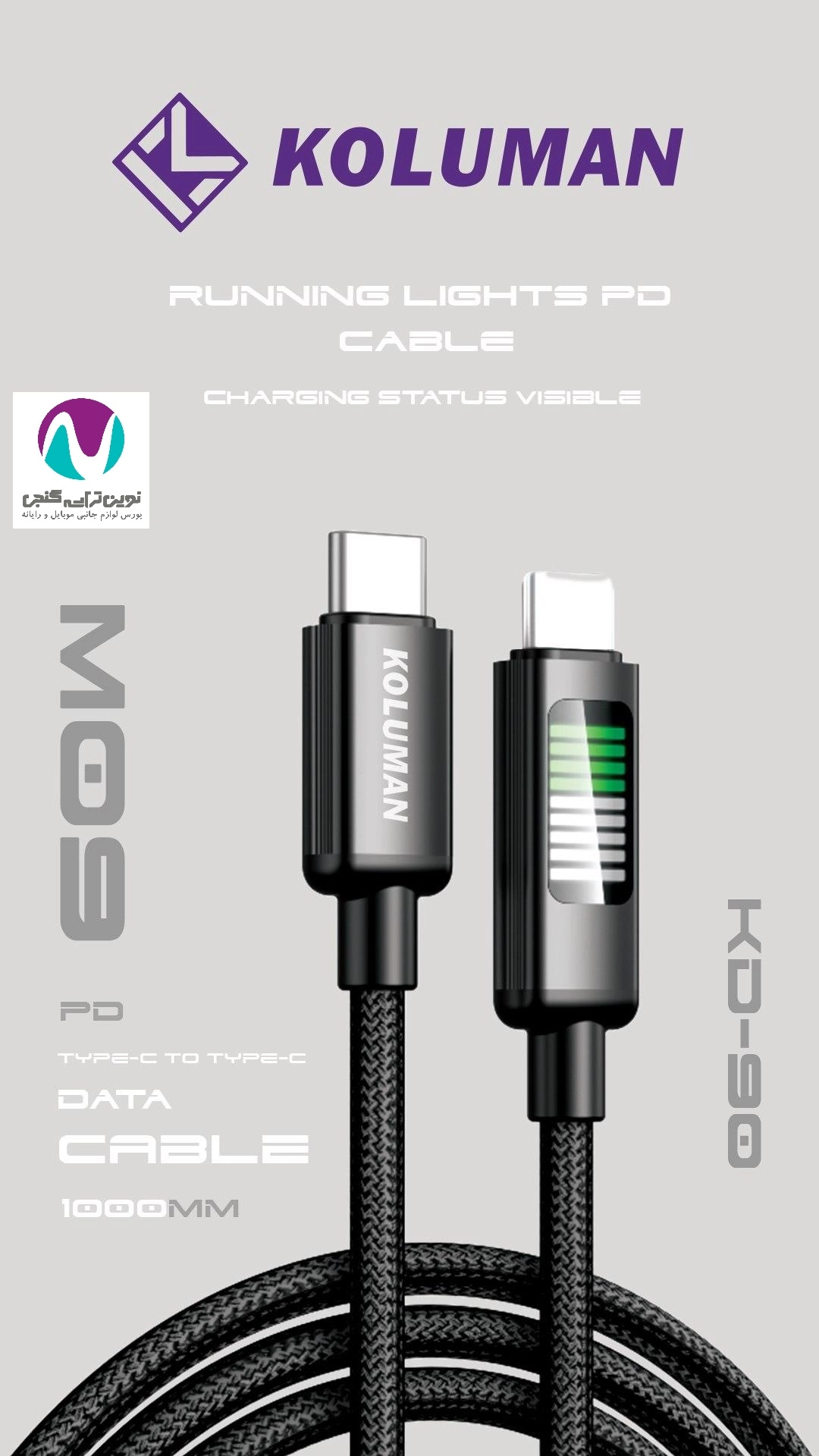 کابل شارژر کلومن Koluman KD 90 TC-TC 60W با توان 60 وات، طراحی مقاوم و سرعت شارژ بالا، گزینهای ایدهآل برای کاربران حرفهای است که به دنبال عملکرد بینقص و دوام طولانی هستند.