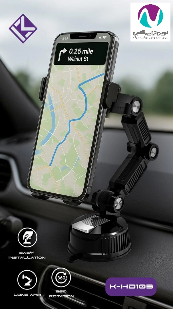 هولدر K-DH105 انتخابی ایدهآل برای کسانی است که میخواهند گوشی خود را با امنیت و راحتی در دسترس داشته باشند و زاویه دید دلخواه خود را تنظیم کنند.